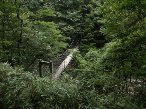 右へ左へと石くれに足をとられよろめきながら、4、50分、眼下に吊り橋が見えてくる。
