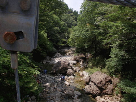 吊り橋から望む下流には川遊びに興じる人たちが。