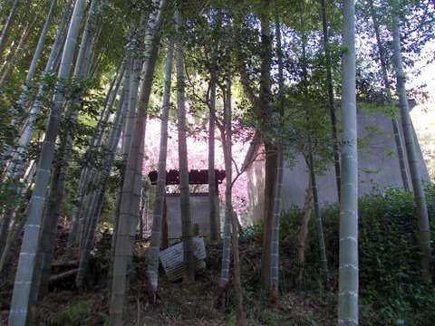 竹林の奥にピンク色が咲き誇るなにか。