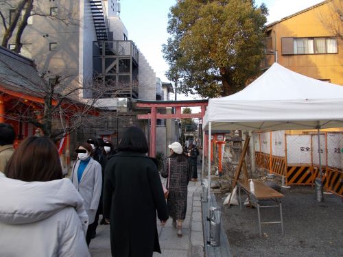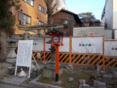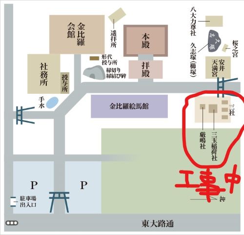 次に三社、三玉稲荷社、厳嶋社に手を合わせる・・・・って、工事中で誰もおらんがな、神さん!