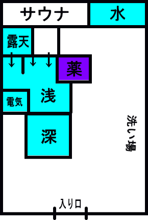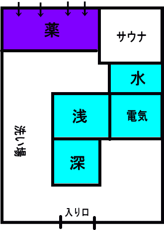 何故か突き当たりにある薬湯が複合浴槽仕様。