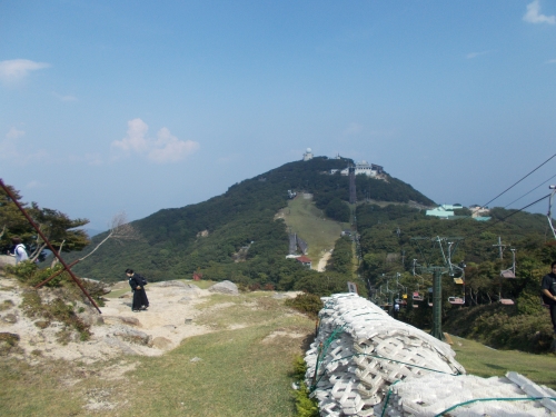 ロープウェイの駅と雨雲レーダーが遠くに見えます。
