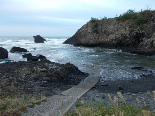 海岸線沿いに道がつながってるんだけど、この荒れようでは曝露は必須、引き返すことにする。